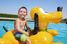 Dmuchany, żółty pies Pluto wyprodukowany przez firmę Bestway na licencji Disney'a z pewnością zapewni dużo rozrywki podczas wyjazdu nad wodę. Z takim pompowanym zwierzakiem nie sposób się nudzić podczas upalnych dni spędzanych nad morzem, jeziorem czy w przydomowym basenie. Zabawka posiada mocny uchwyt do trzymania oraz spore wymiary 117 x 107 cm, dlatego zapewni podopiecznym dużo komfortu podczas zabawy. Ponadto, dmuchany Pluto jest bardzo lekki, waży około 1 kilograma, więc dziecko bez wysiłku będzie mogło samodzielnie biegać z nim po brzegu, a z opieką dorosłego popływać nad morzem, nad jeziorem lub na basenie. Zabawka wykonana została z trwałego tworzywa PVC odpornego na przetarcia, jednakże w razie uszkodzenia powierzchni dmuchanej, do zestawu załączona została łatka naprawcza. Dodatkową zaletą jest wyprofilowane siedzisko na grzbiecie pieska oraz jego rozłożone łapy, które działają jako stabilizatory. Dzięki nim zabawkę trudniej jest przewrócić. Ukochany piec Pluto z bajki Disney'a to wierny towarzysz wielu dzieci, na pewno sprawi wszystkim wiele frajdy i pomoże przełamać lęk przed wodą.